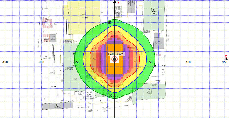 Idéalement, aucun effet thermique ne doit se situer en dehors des limites du site. Toutefois, pour se conformer aux dispositions de l’arrêté du 11 avril 2017, il est impératif que les effets thermiques des zones rouges et oranges soient localisés à l’intérieur du périmètre défini.
